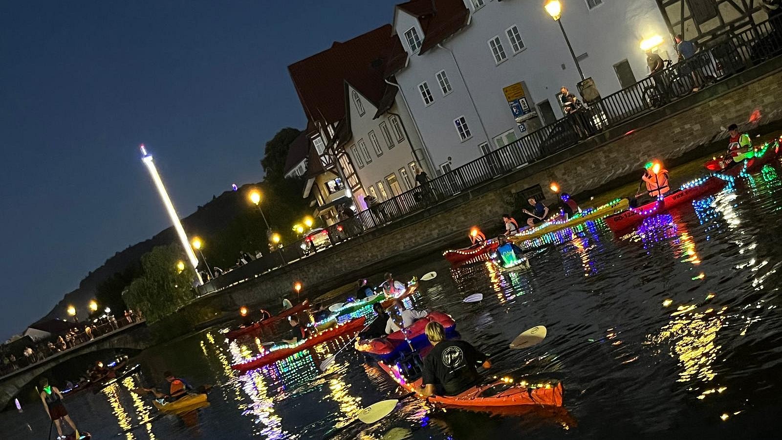 Einmal im Jahr wird es magisch auf der Werra: bei der Lichterfahrt zum Johannisfest in Eschwege begleiten wir mit unserem Boot die festlich geschmückten Kanuten.